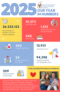 Family-centered care is an approach to health care where the entire family is fully supported, engaged, involved and able to make informed decisions about the care and support services provided to their sick child. For that care model to succeed, family proximity to a hospitalized child is crucial. Research shows that families who stay at a Ronald McDonald House report more positive hospital experiences and a greater ability to participate in their child’s care.
